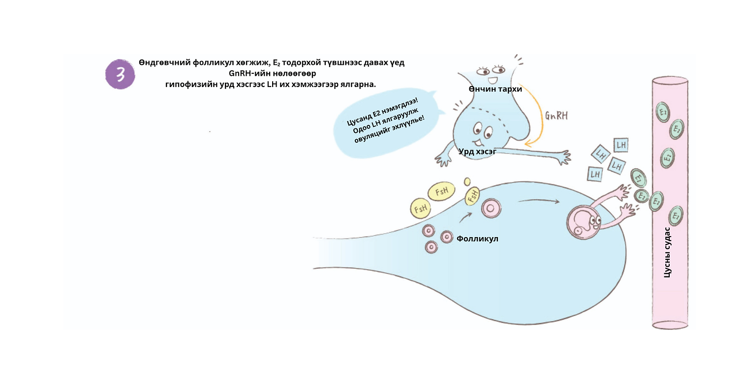Өндгөвчний фолликул боловсорч, цусан дахь E2-ийн хэмжээ тодорхой түвшнээс давмагц өнчин тархины урд хэсгээс LH их хэмжээгээр ялгарна.
